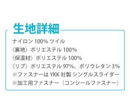 袖・裾のリブで冷たい風の侵入を防ぐ。