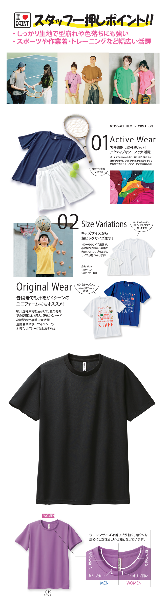 シルエットはスタンダードなタイプとなっており、カジュアルからアクティブなシーンまでご利用いただける、オリジナルドライTシャツのベースとして最適な一枚です。