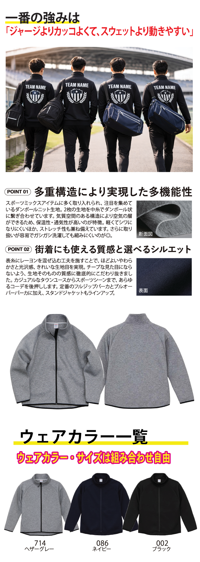 ユニフォームや移動着にもぴったり。