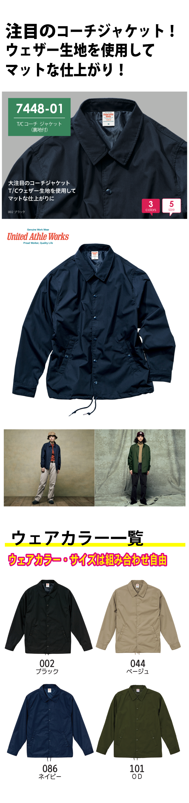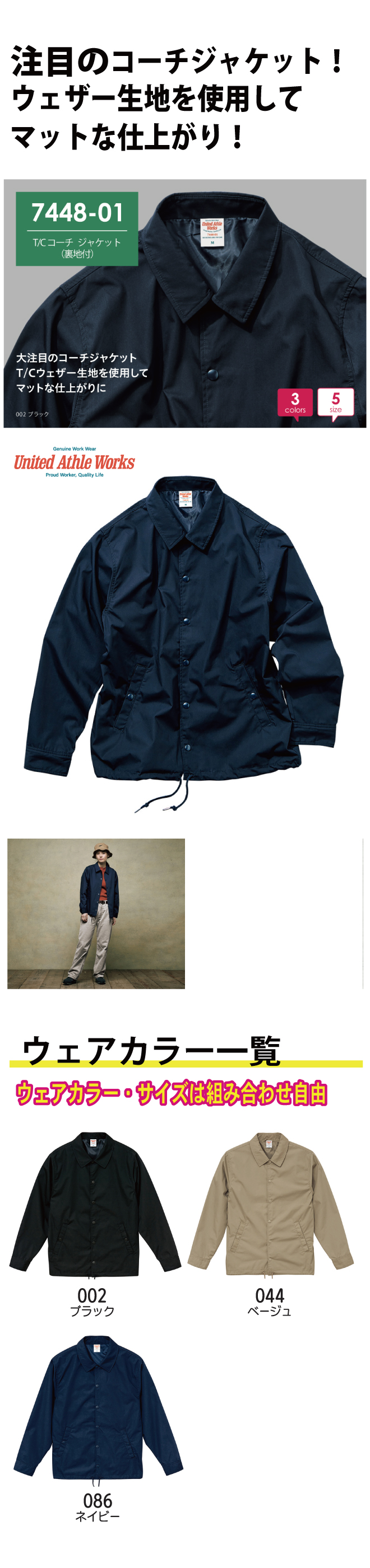 コーチジャケットをT/Cウェザーのマットな生地で仕上げ、L.A.ワーカーのスタイルを体現。シンプルながら随所へこだわりを詰め込み、「働く人の誇りを支える一枚」に。ユニフォーム・ワークウェアとしてだけでなく、もちろんストリートスタイルへのコーディネートにも欠かせない!