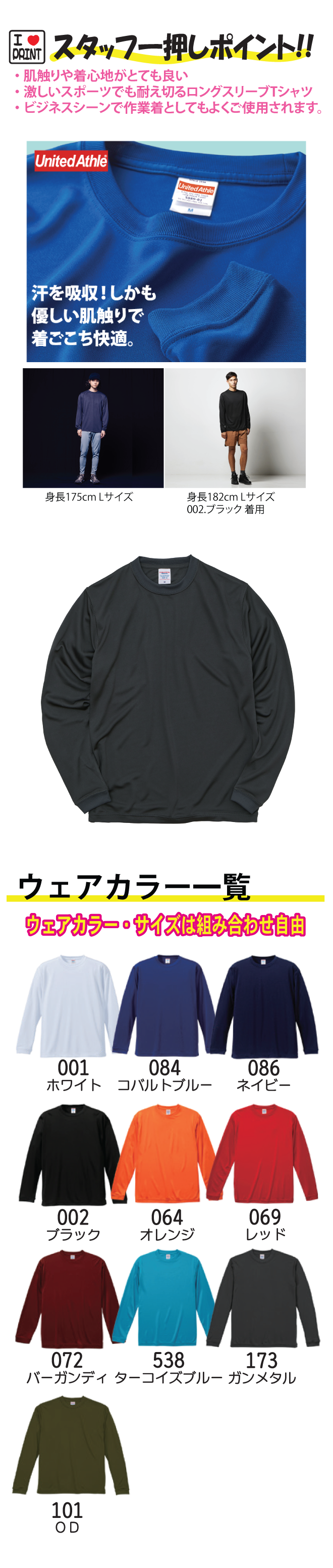 ヘビーに使いたいスポーツTシャツだからこそ、着心地のよさが大切。厚さとやわらかさの両立にこだわった生地は、鮮やかな発色もポイントです。寒い時期にぴったりな長袖タイプ。